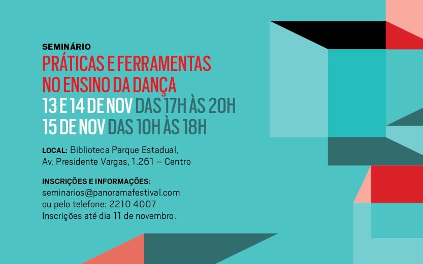 Dentro da programação da 23ª edição do Festival Panorama, nos dias 13, 14 e 15 de novembro, as novas instalações da Biblioteca Parque Estadual irão receber o Seminário Práticas e Ferramentas no Ensino da Dança. Através de uma abordagem teórico-prática, o objetivo é incentivar a reflexão crítica e o intercâmbio entre várias ferramentas e metodologias inovadoras de formação nas artes do corpo e na dança contemporânea. Voltado para professores de dança do ensino formal, alunos de cursos de licenciatura de educação e artes, agentes culturais, artistas e interessados em geral.